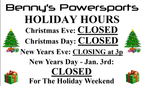 Benny's Powersports Specializes in ATV Repair, Parts, & Sales, Snowmobile Repair, Parts, & Sales, UTV Repair, Parts & Sales, and Dirt Bike Parts & Repair, as well as all OEM & Aftermarket Parts, Accessories, & Apparel.